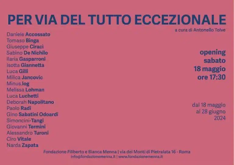 La Fondazione Filiberto e Bianca Menna, in collaborazione con il Lavatoio Contumaciale di Roma, la Kyro Art Gallery di Pietrasanta, il Tomav Experience di Ancona, la Galleria Matteo Ragni di Forlì e Bianco Contemporaneo di Roma è lieta di annunciare la collettiva Per via del tutto eccezionale che si terrà nella sede romana della Fondazione, già Archivio Tomaso Binga, in via dei Monti di Pietralata 16, dal 18 maggio al 28 giugno 2024, con opere di Daniele Accossato, Tomaso Binga, Giuseppe Ciracì, Sabino De Nichilo, Ilaria Gasparroni, Isotta Giannetta, Luca Gilli, Milica Jancovic, Minus.log, Melissa Lohman, Luca Luchetti, Deborah Napolitano, Gino Sabatini Odoardi, Paolo Radi, Simoncini.Tangi, Giovanni Termini, Alessandro Turoni, Ciro Vitale e Narda Zapata.